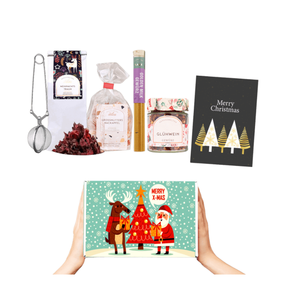 Exklusive Genüsse in diese Weihnachtsbox. Sie enthält eine Weihnachtskarte, Schoko-Schnee Mandeln (125 g), ein Edelstahl-Teesieb, Bonbon Spezialität Backapfel (120 g), Glühweingewürz im Glas (50g) und eine Wintergetränk-Mischung Golden Milk im Reagenzglas (18g).