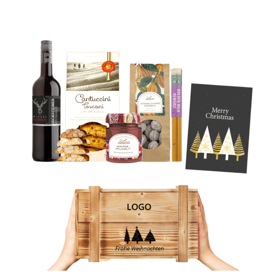 Überraschen Sie Mitarbeiter und Kunden zu Weihnachten mit dem "Gourmet Weihnachtsmarkt". Diese luxuriöse, geflammte Holzkiste enthält eine Auswahl an hochwertigen Produkten, die für festliche Freude sorgen. Die Box beinhaltet einen roten Glühwein (0,75 Liter), Schoko-Schnee Mandeln (125 g), Cantuccini Weihnachtsgebäck Mandorle Toscani (150 g), Winterpflümli Fruchtaufstrich (175 g), Golden Milk im Reagenzglas und eine liebevoll gestaltete Weihnachtskarte.Â