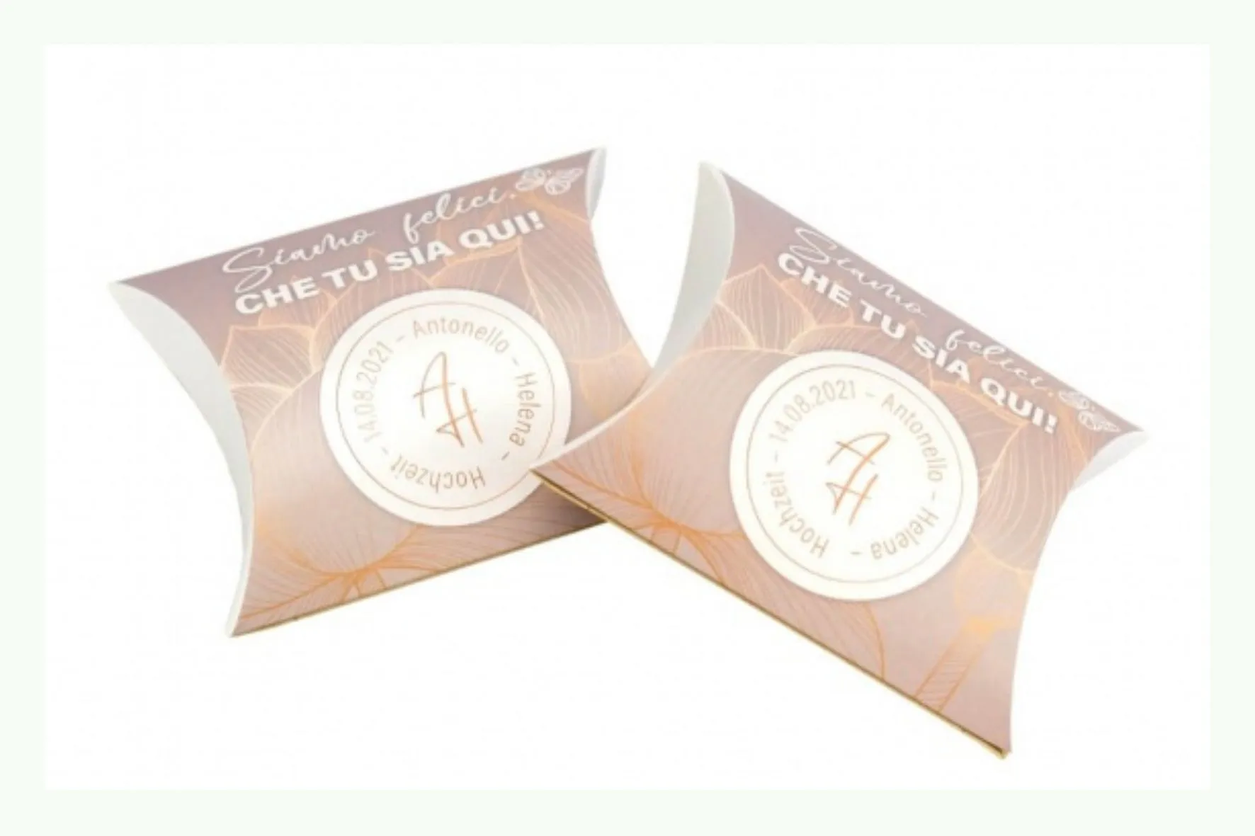 Con il suo design piatto, la scatola a cuscino è anche una soluzione di imballaggio estremamente salvaspazio. Scopri come puoi personalizzare la tua pillow box con le nostre opzioni di design qui!