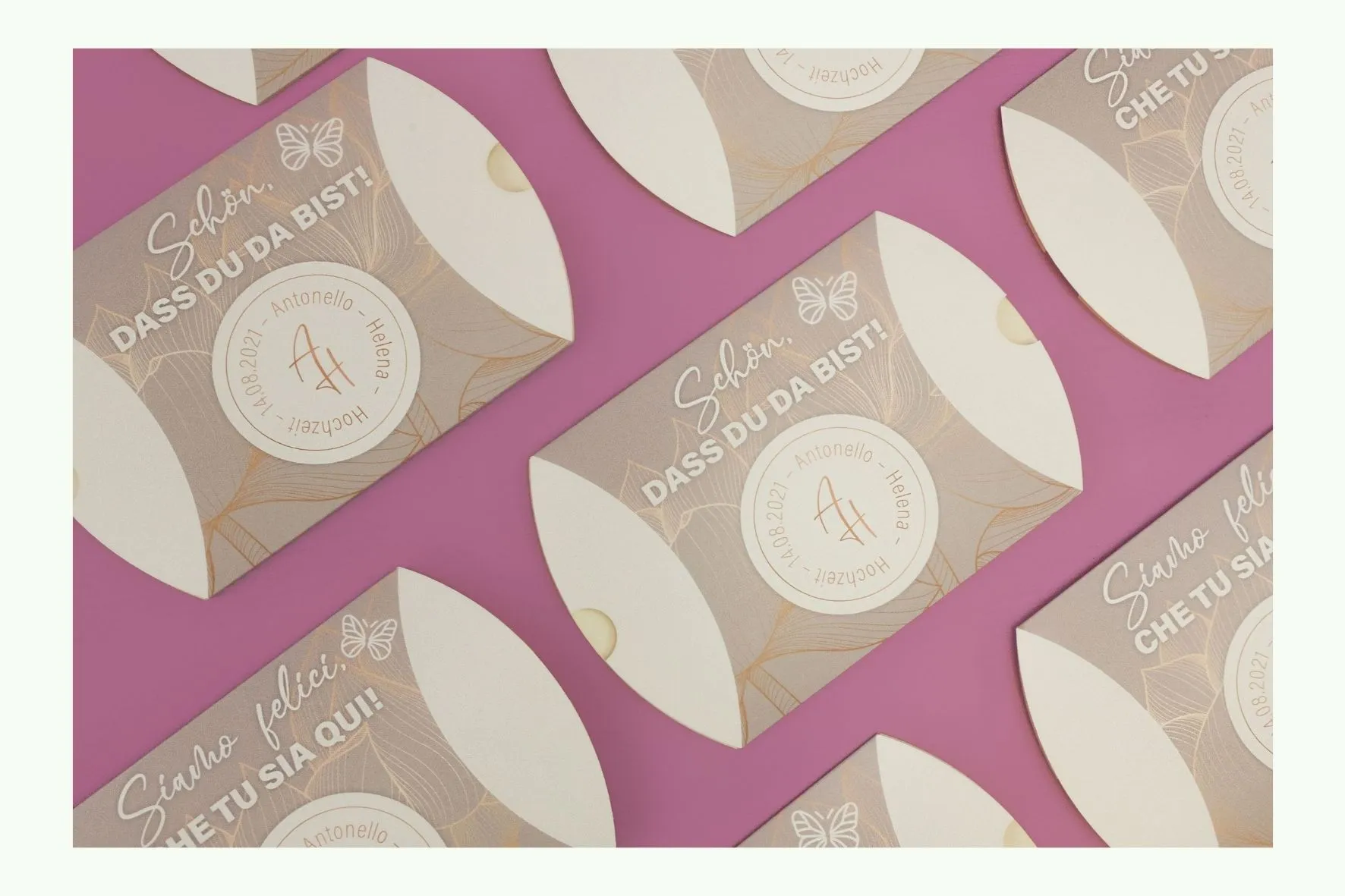 Grazie alla stampabilità su tutta la superficie, è possibile coprire in continuità la scatola a cuscino con un design unico. In alternativa, la parte anteriore e posteriore o i lembi laterali incernierati possono essere progettati diversamente per enfatizzare ancora di più la forma speciale della scatola.